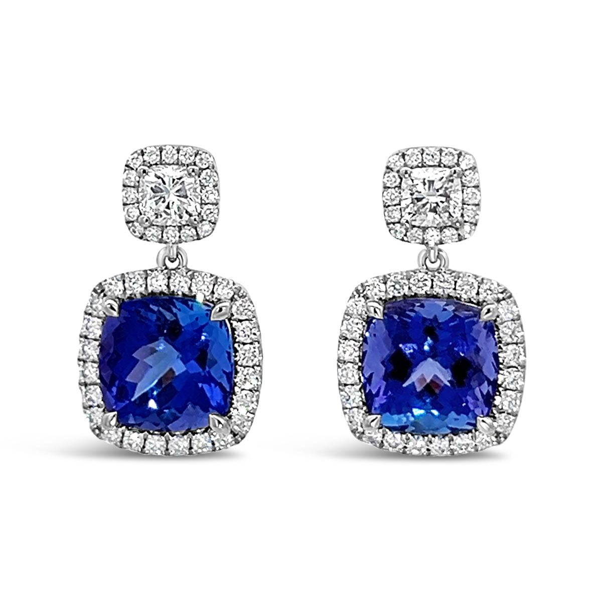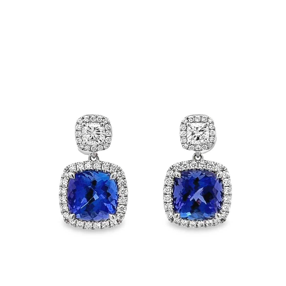 18KW Diamond Halo Earrings, 2CUSH/TANZ 5.53CT, 2 Cush 0.50ct & 80 RD 0.48ct G/H VS-SI