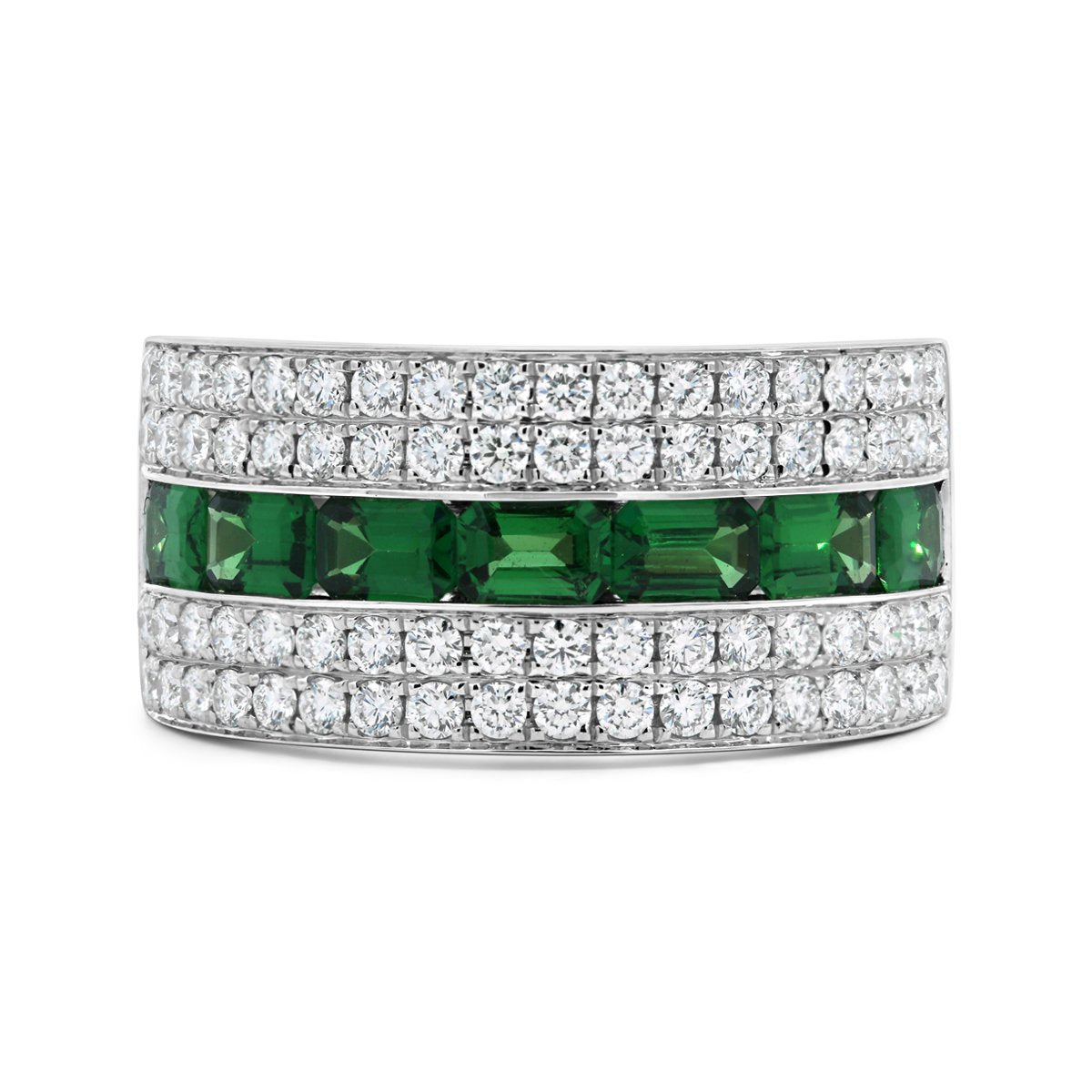 This 10.5mm wide band is crafted in 18K white gold and features 9 green garnets totaling 1.69 carats alongside 72 round diamonds totaling 0.90 carats with F/G color and VS clarity. The substantial width accommodates the bold arrangement of vibrant green garnets and brilliant diamonds.