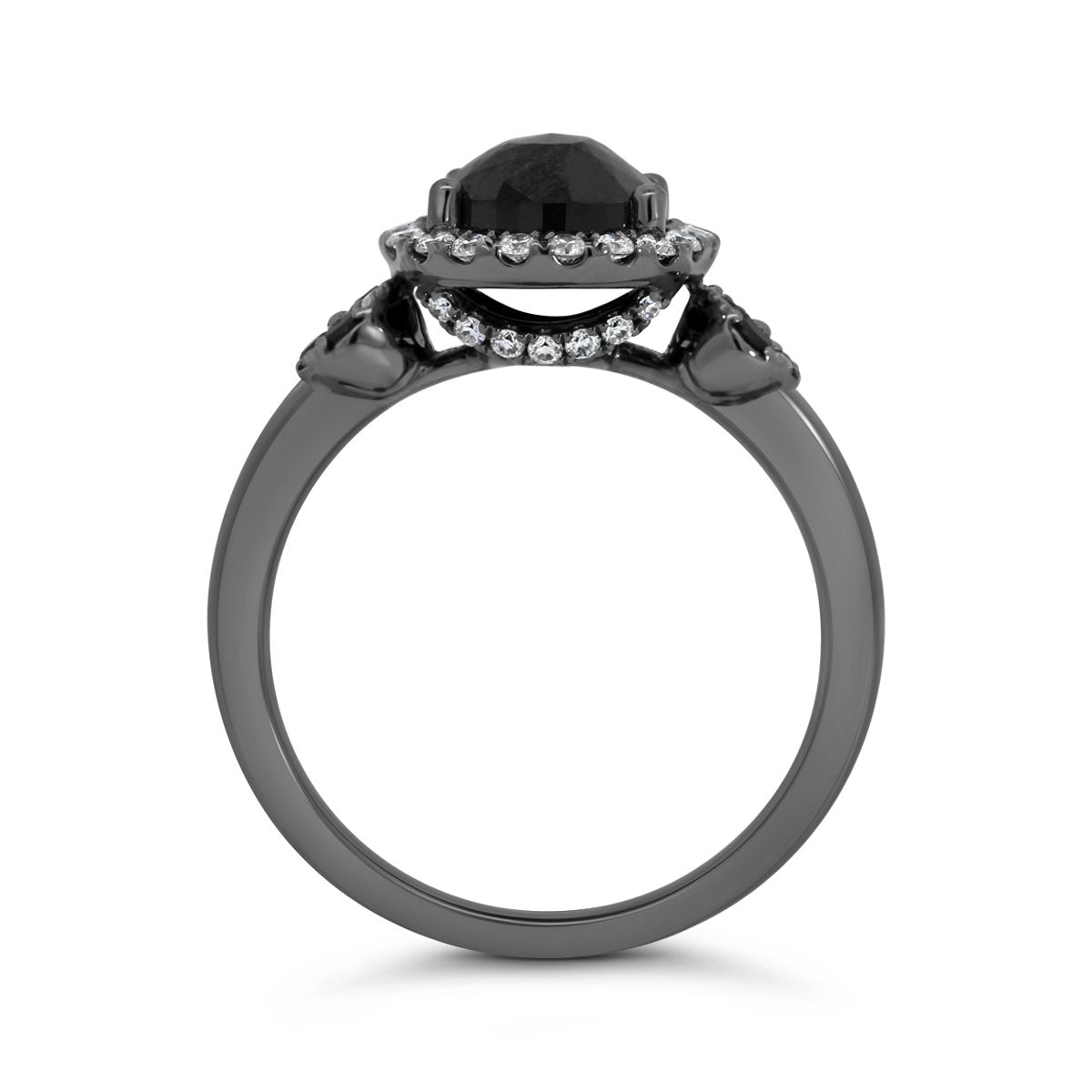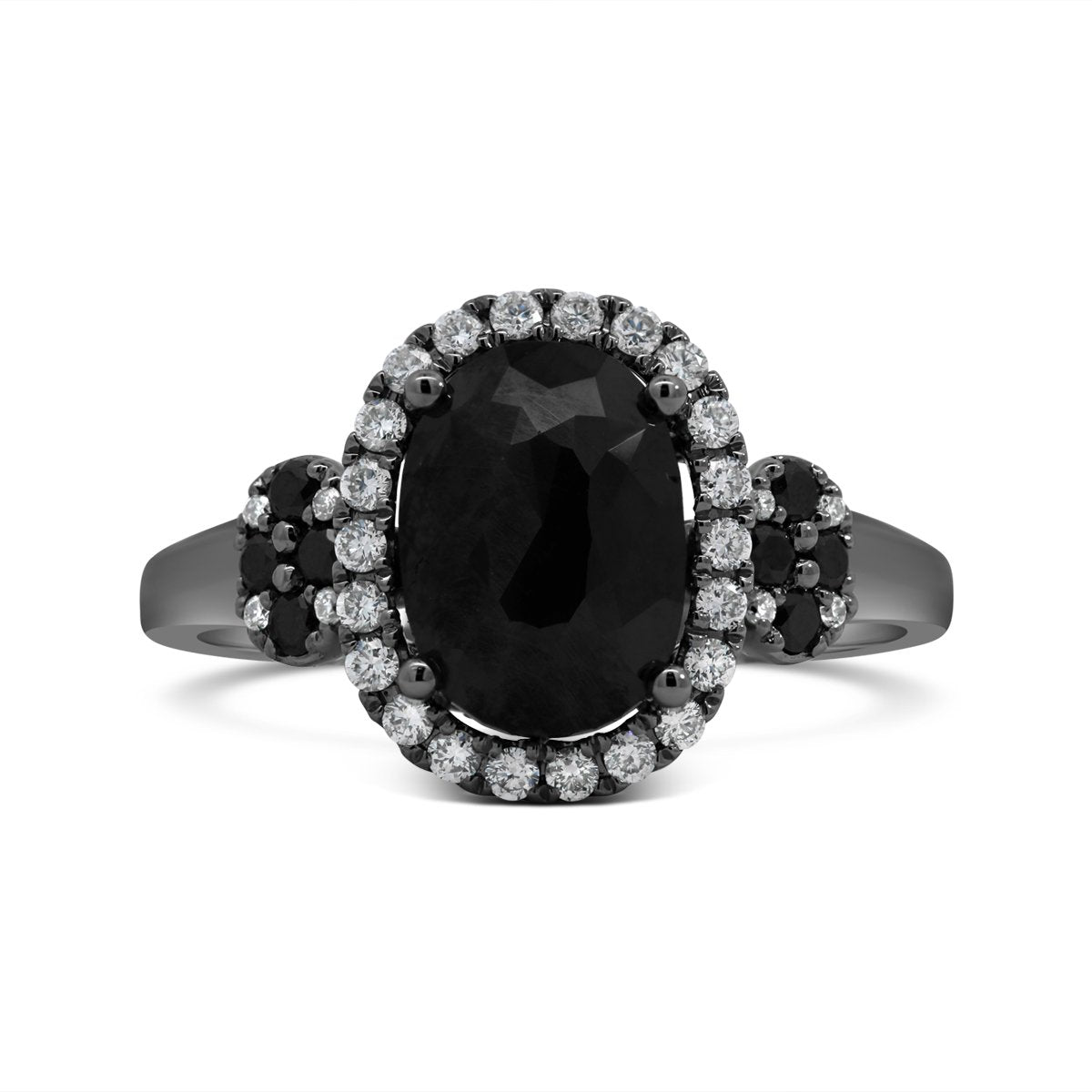This halo ring combines 18K white gold and black rhodium with a central oval black diamond weighing 2.04 carats. The center stone is surrounded by a halo of 22 diamonds. Additionally, 8 round black diamonds totaling 0.14 carats on the band is giving a Three Stone ring look.