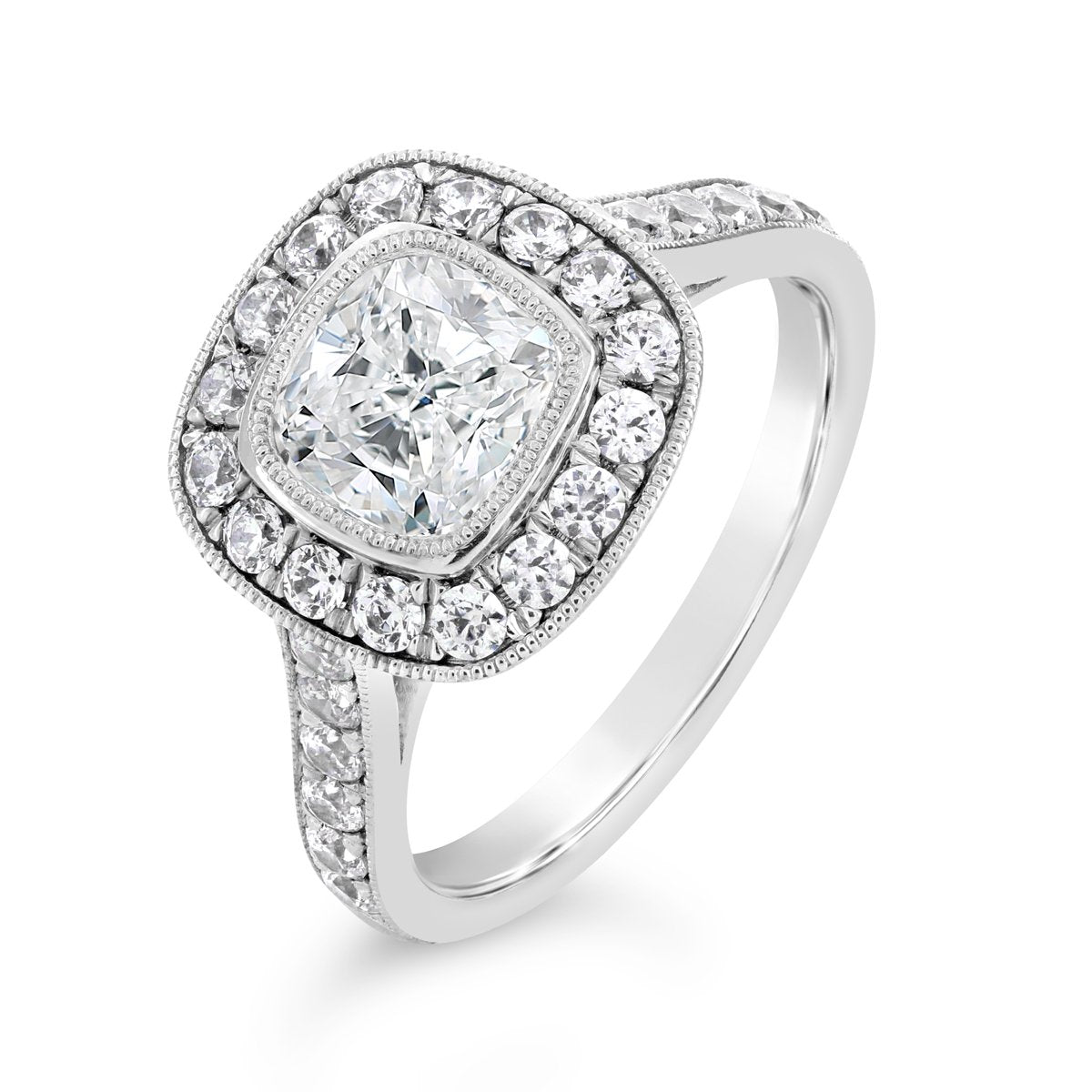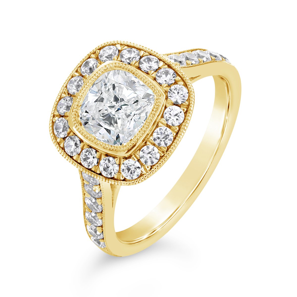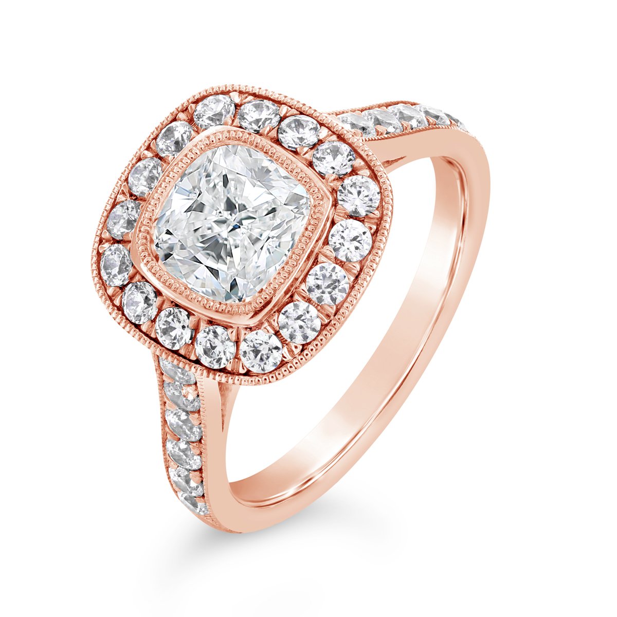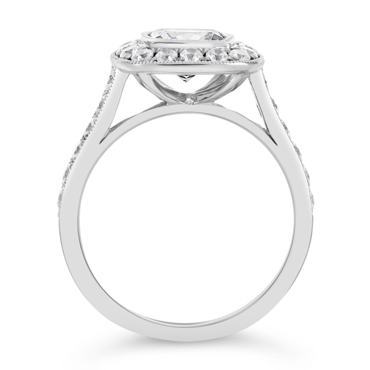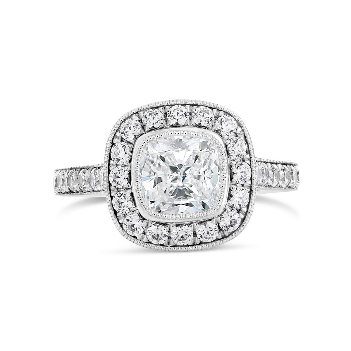 Style No. ACB045 Halo Diamond Engagement Ring Shown with 1.50 ct Cushion Cut Bezel Set Diamond Center & Milgrain Finish (Center Diamond Sold Separately)
