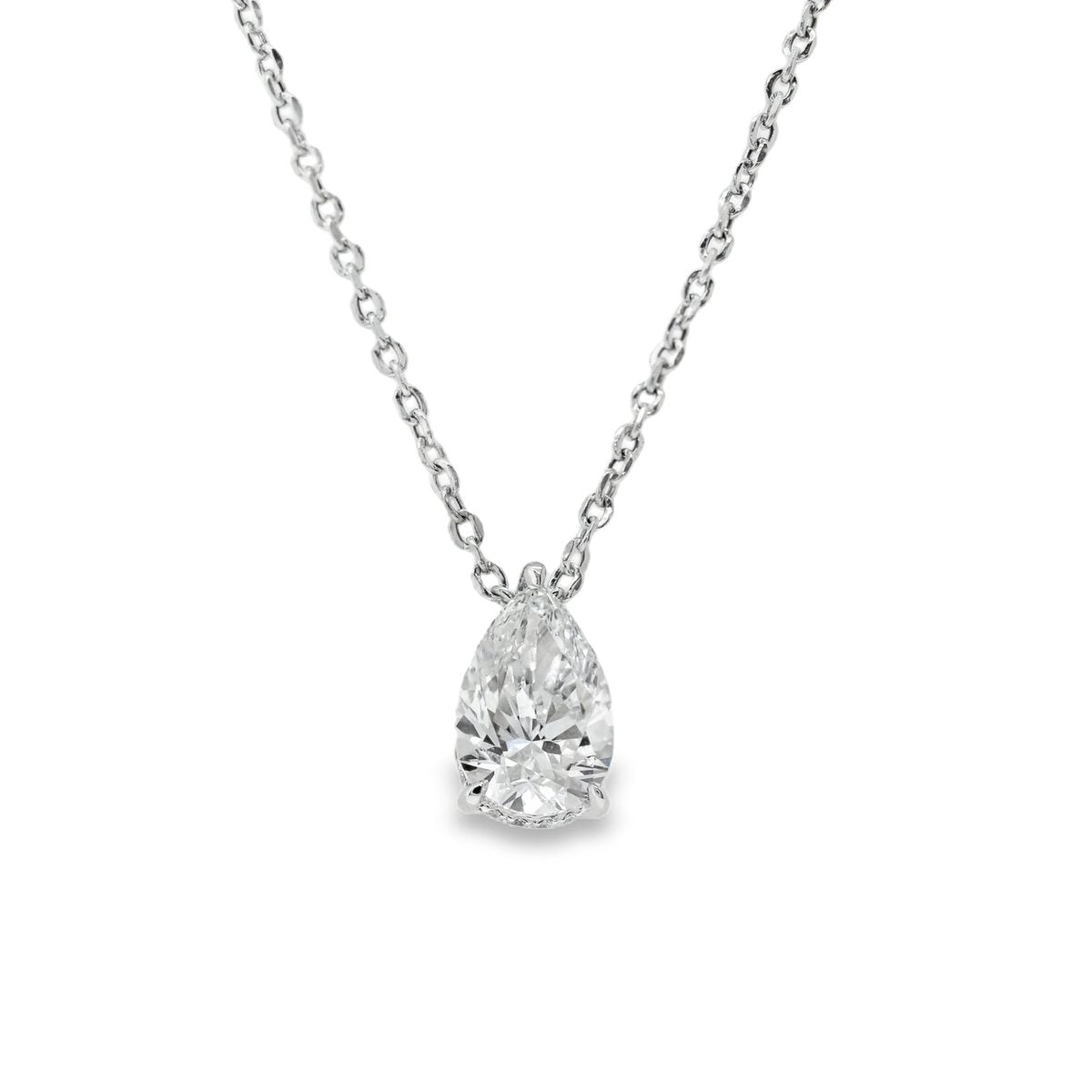 This 16/18 inches long, 18K white gold solitaire necklace features a 2.54 carat F color VVS2 clarity pear-shaped lab-grown diamond, certified by IGI. The main diamond rests above a hidden halo set with 20 natural diamonds.