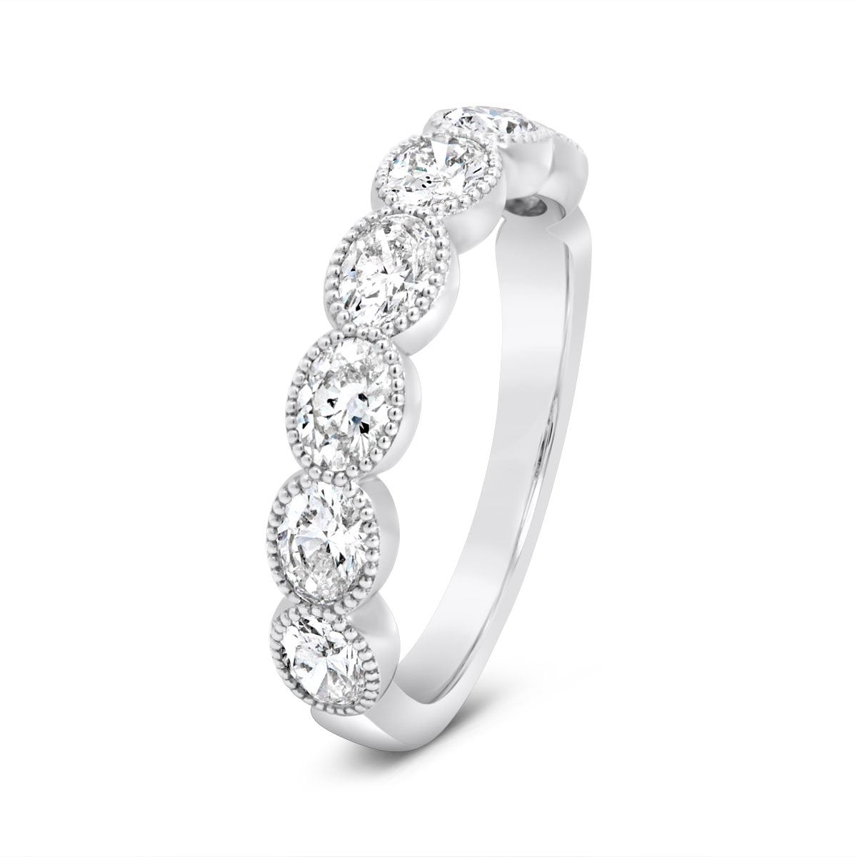 This refined diamond band features an elegant milgrain finish, creating a delicate beaded texture along the edges that adds vintage-inspired character and intricate detail. The band is set with 7 oval-cut diamonds with a total carat weight of 1.20 carats