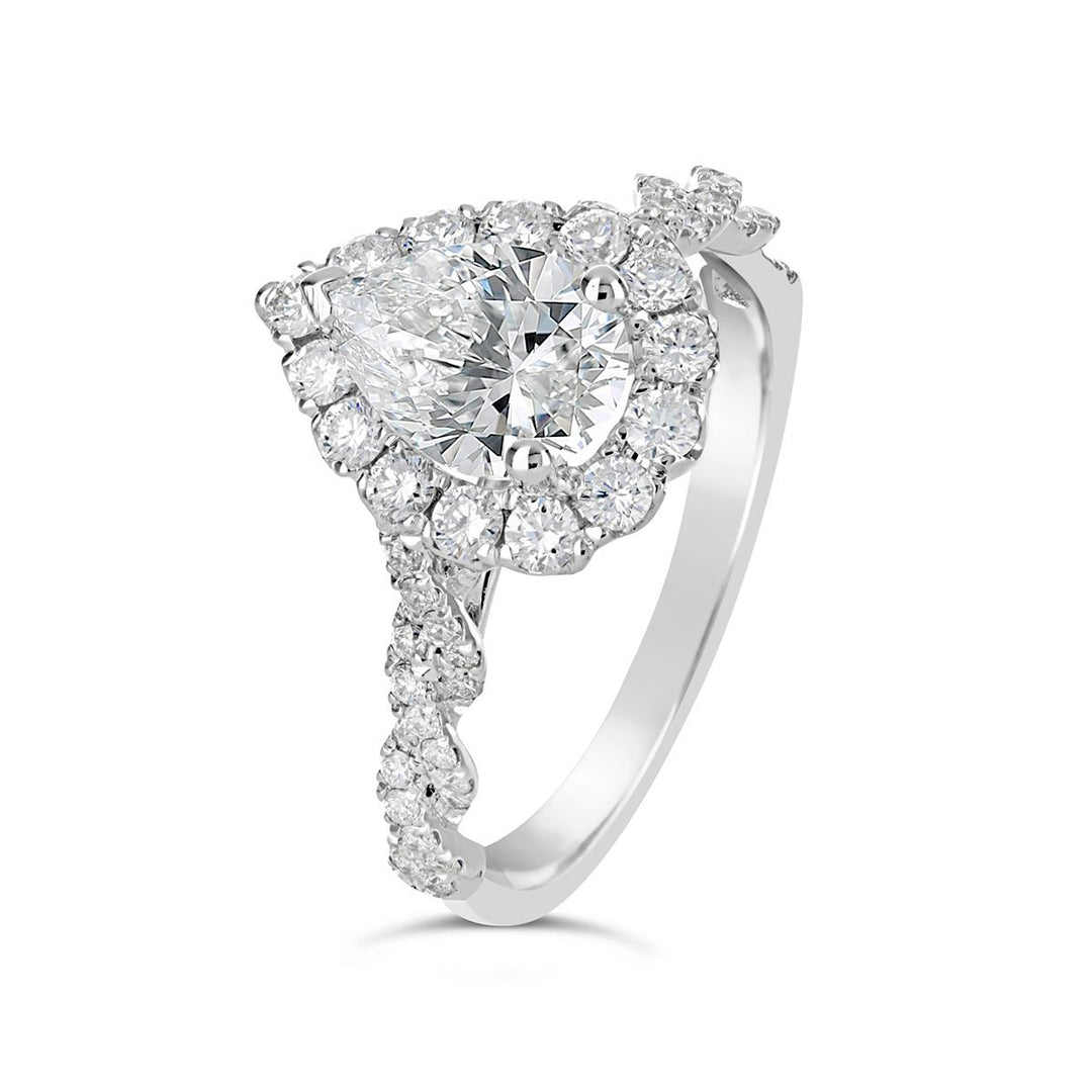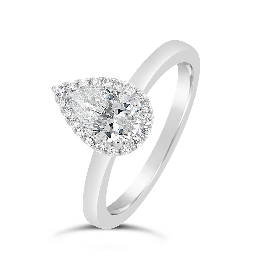 A halo setting features a ring of smaller diamonds surrounding the center pear-shaped diamond, creating an effect that enhances its size and brilliance. This style is ideal for those who want a more glamorous look with added sparkle. The halo setting also protects the pointed end of the diamond, adding durability.