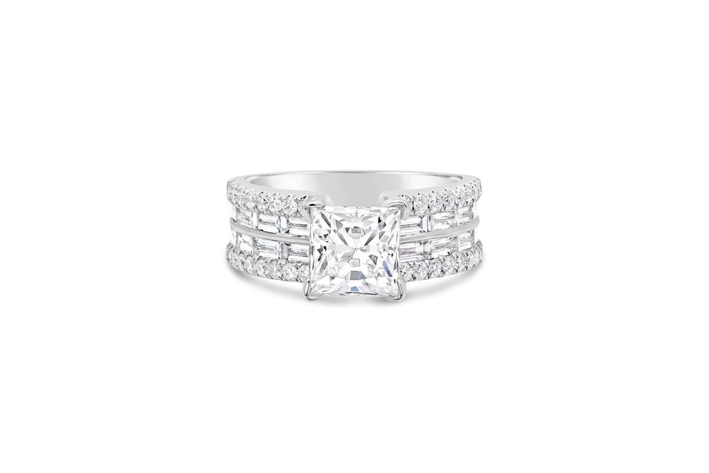 • Three-Stone Rings – Combine with baguettes, round side stones, or colored gems