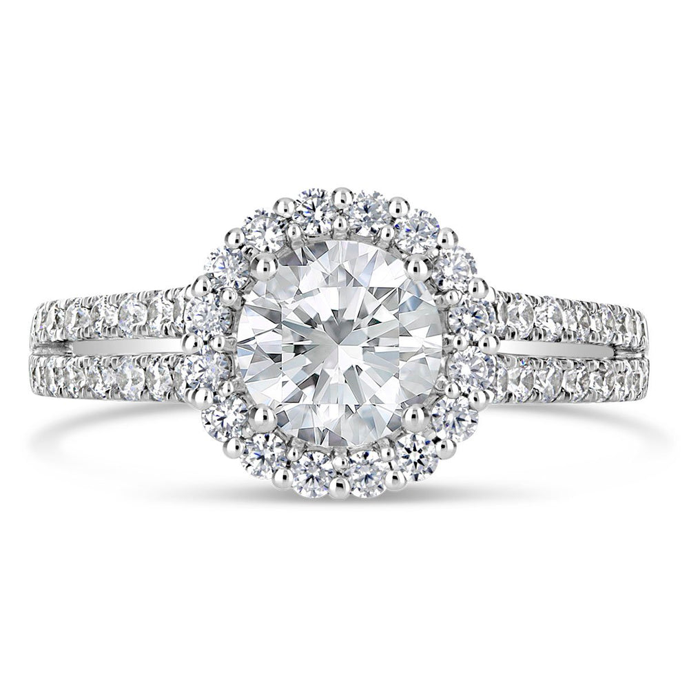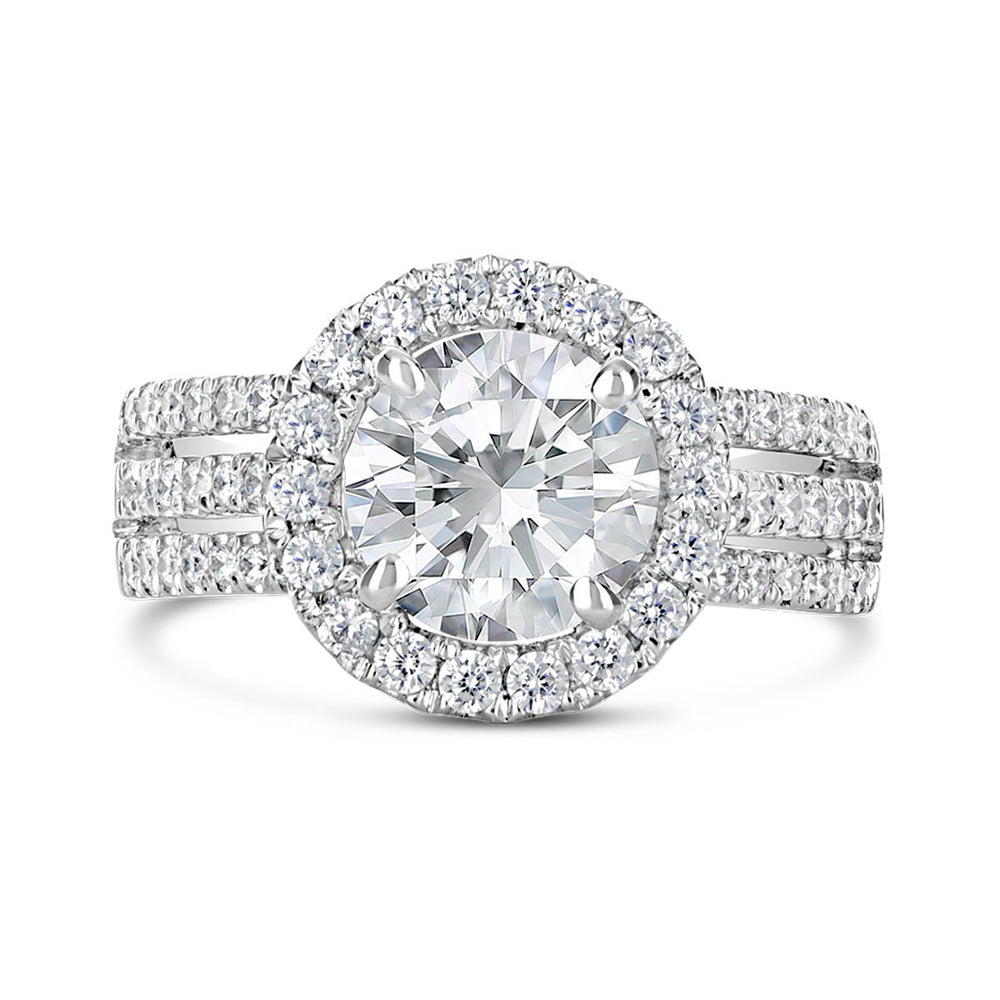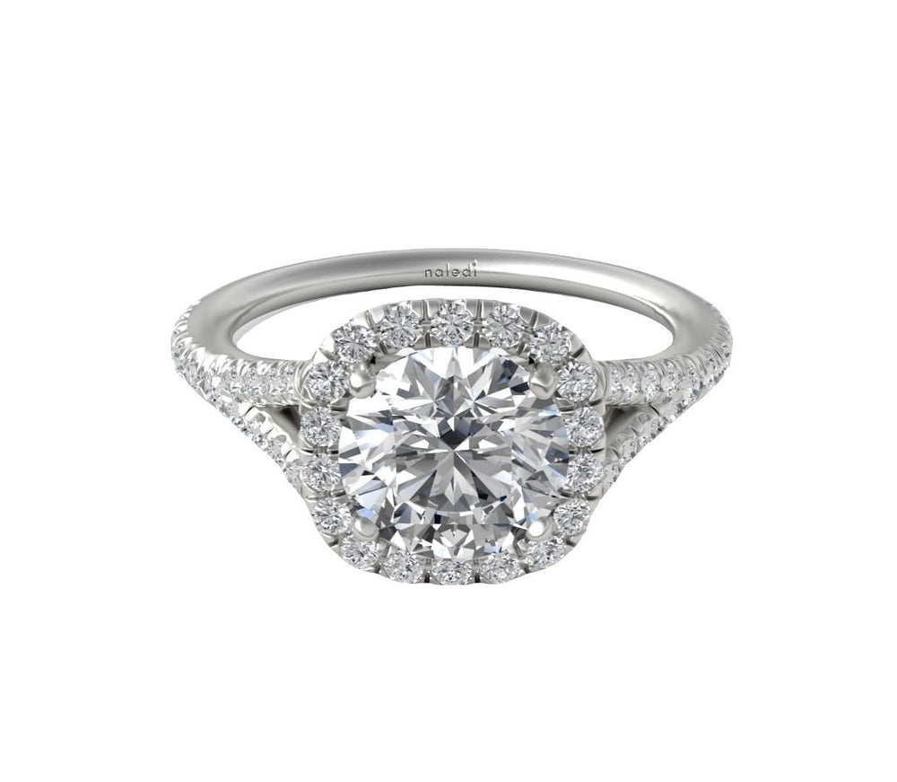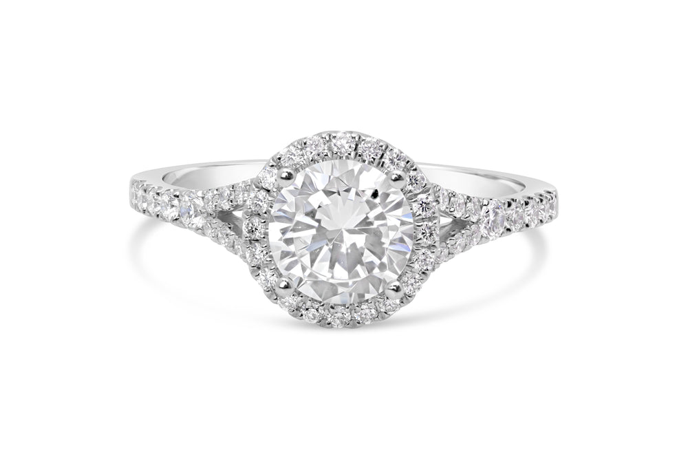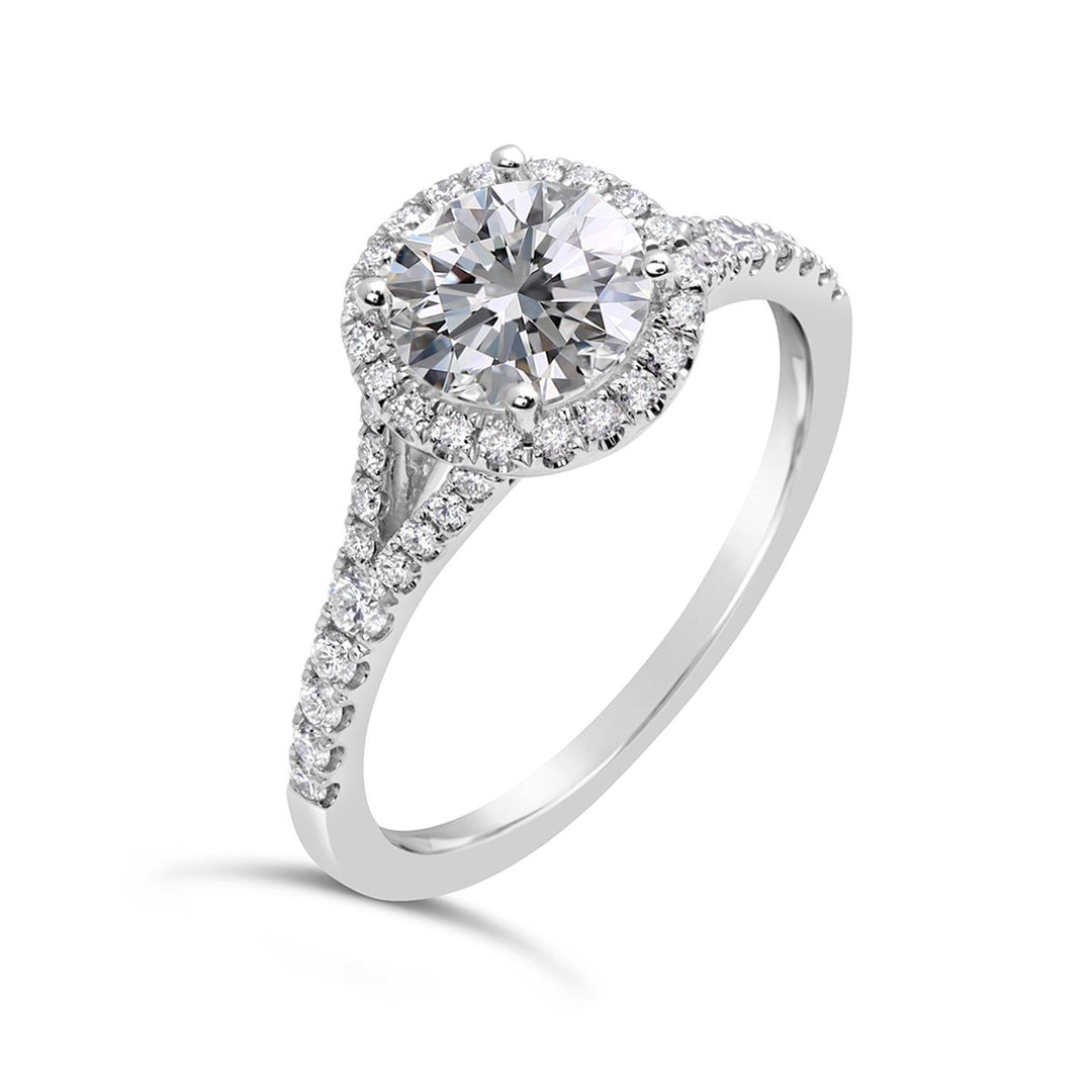 A halo setting combined with a split shank creates a dazzling effect, amplifying the sparkle of the center stone. This design is perfect for brides who want a ring that exudes brilliance and glamour. -
