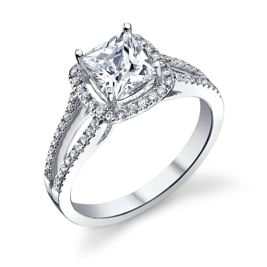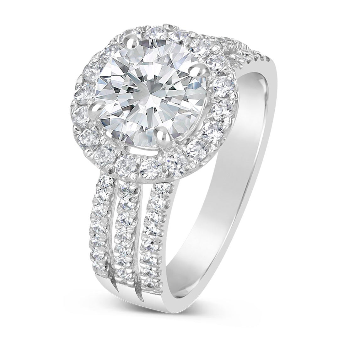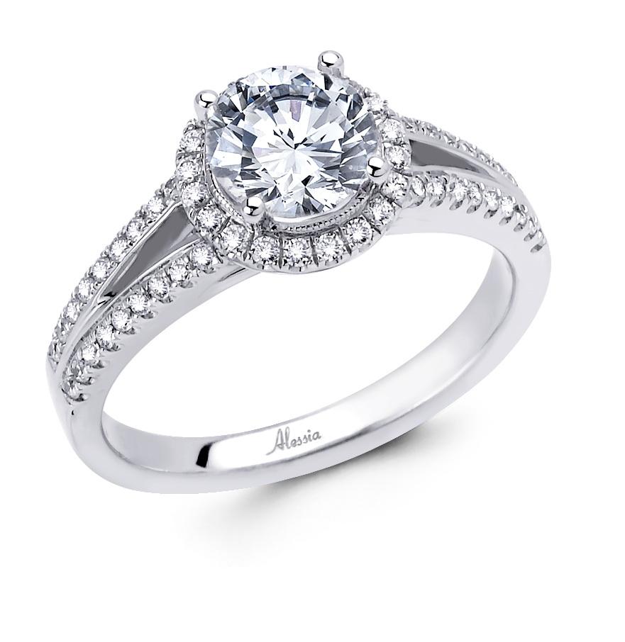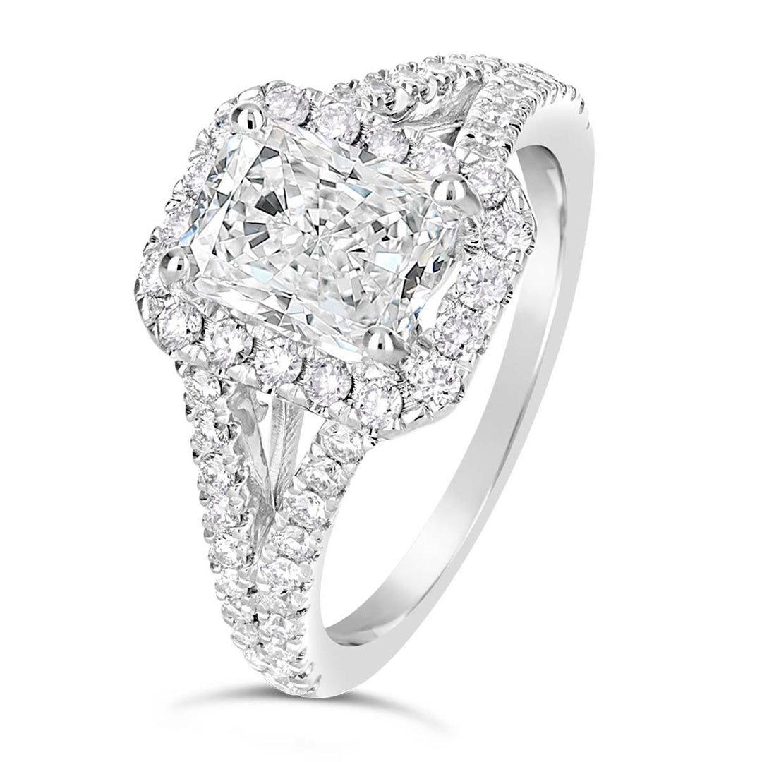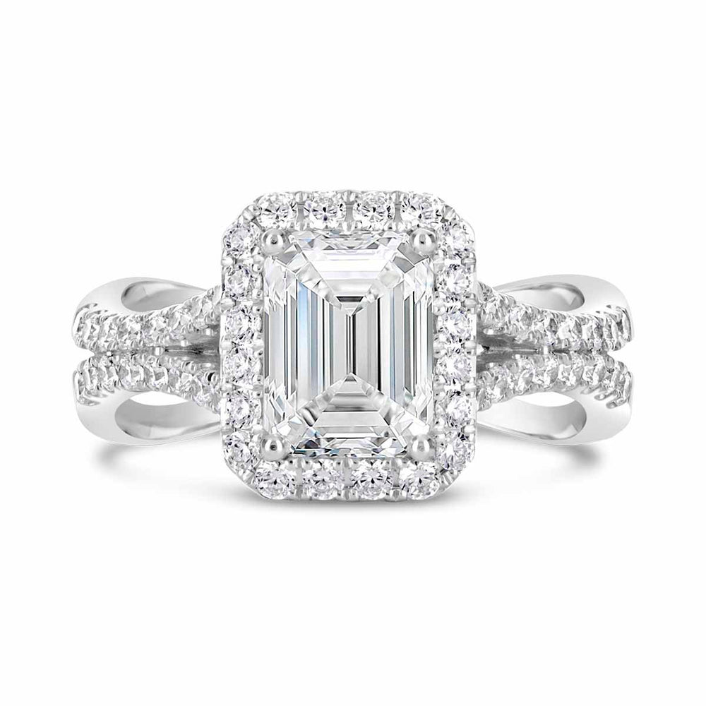 A halo setting combined with a split shank creates a dazzling effect, amplifying the sparkle of the center stone. This design is perfect for brides who want a ring that exudes brilliance and glamour. -