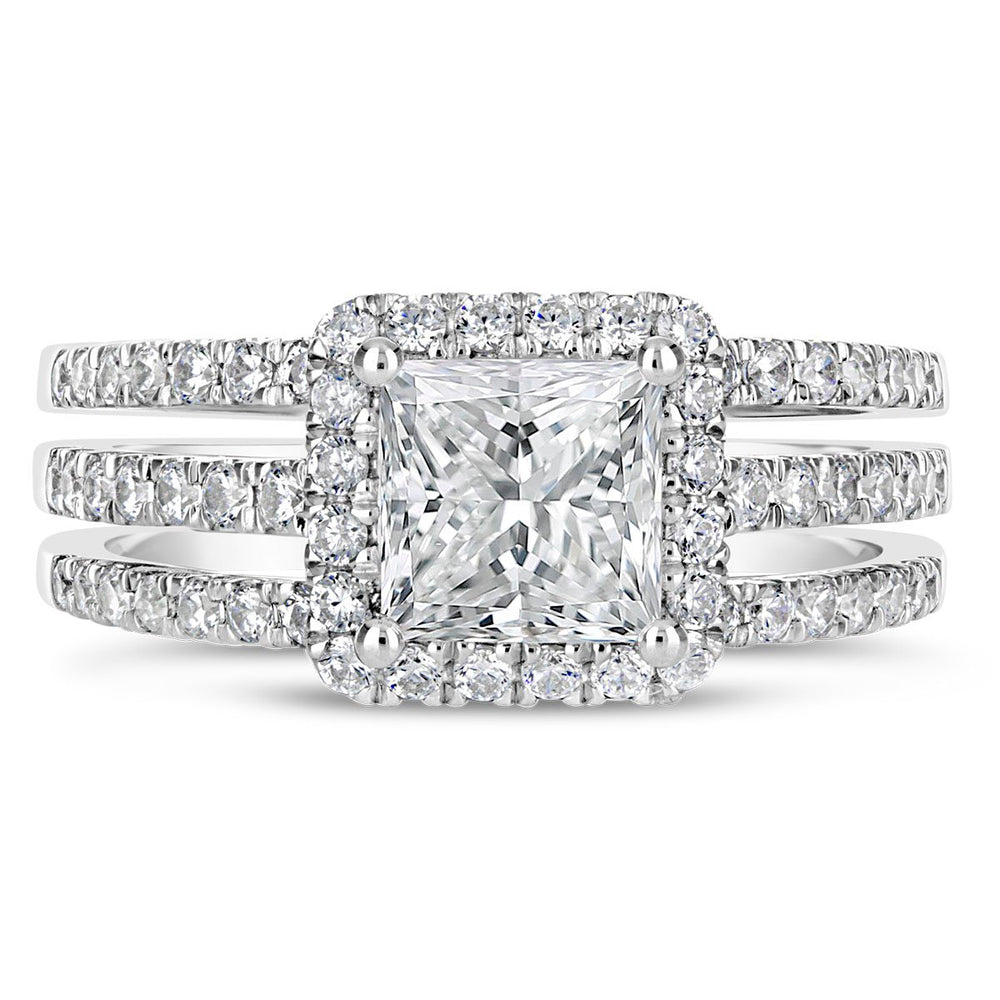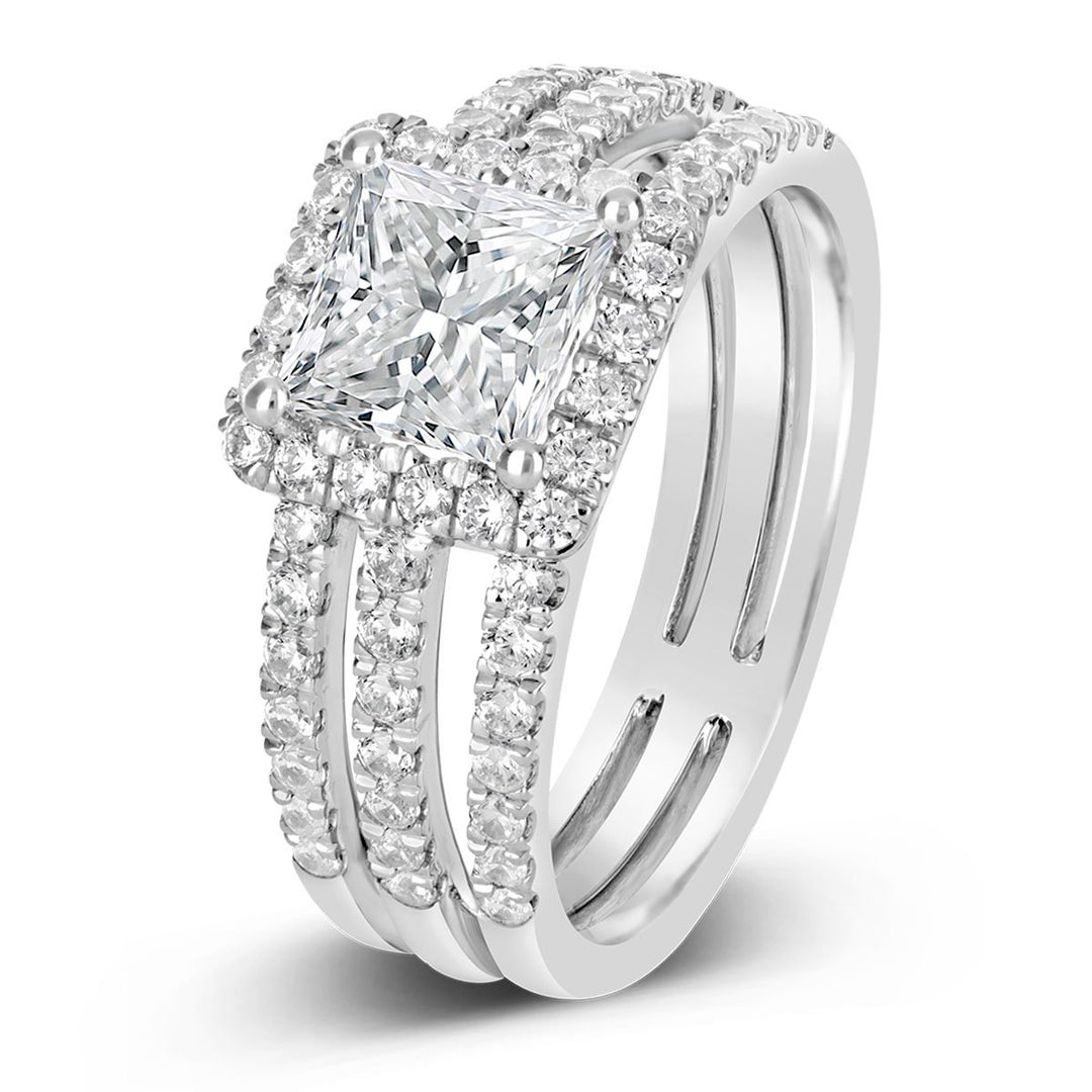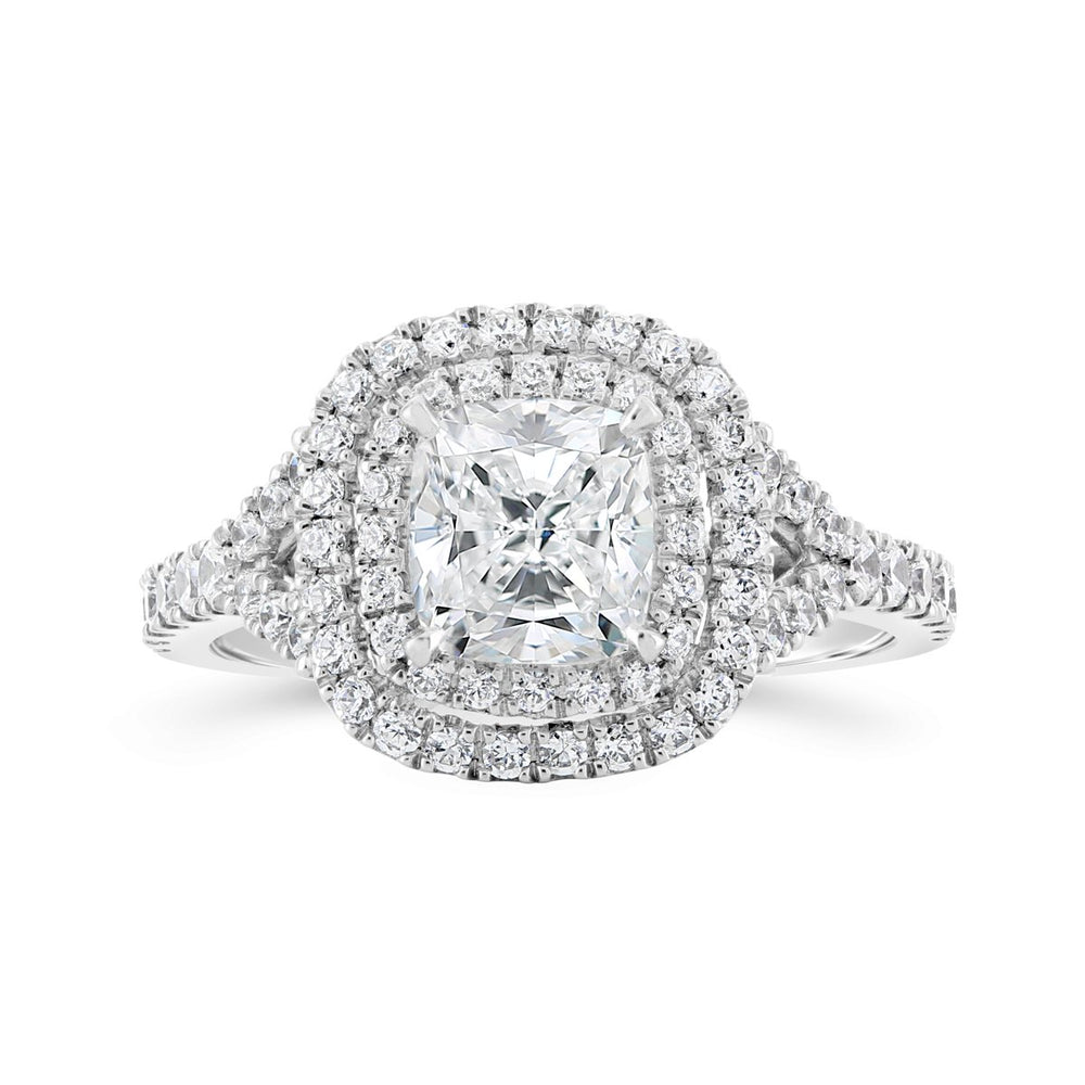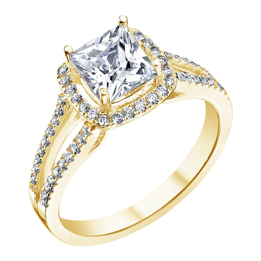 A halo setting combined with a split shank creates a dazzling effect, amplifying the sparkle of the center stone. This design is perfect for brides who want a ring that exudes brilliance and glamour. -