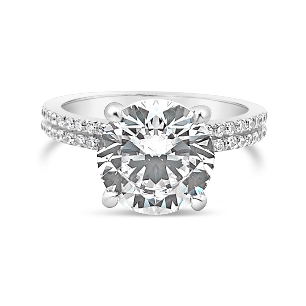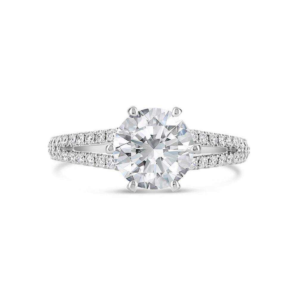 The split design draws the eye directly to the center stone, ensuring it remains the star of the show. This makes it an ideal choice for anyone seeking to maximize the impact of their diamond or gemstone. -