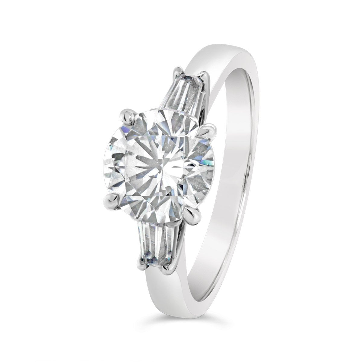 Three Stone Diamond Engagement Ring shown with a 2.00 ct. center round cut diamond and two tapered baguettes . (Center Diamond Sold Separately)