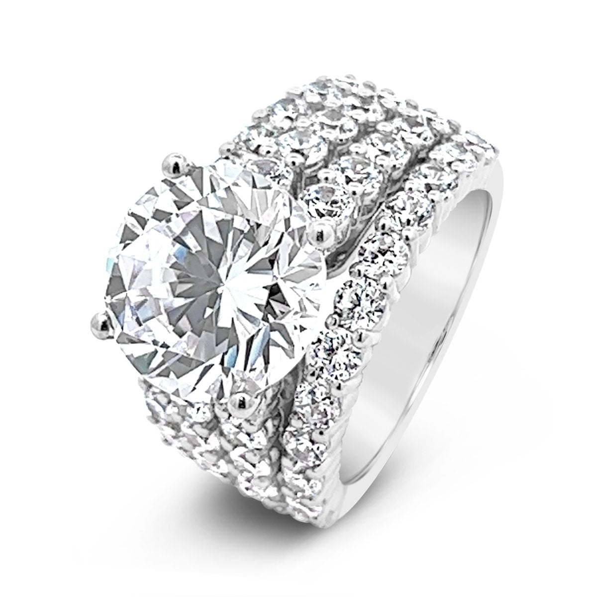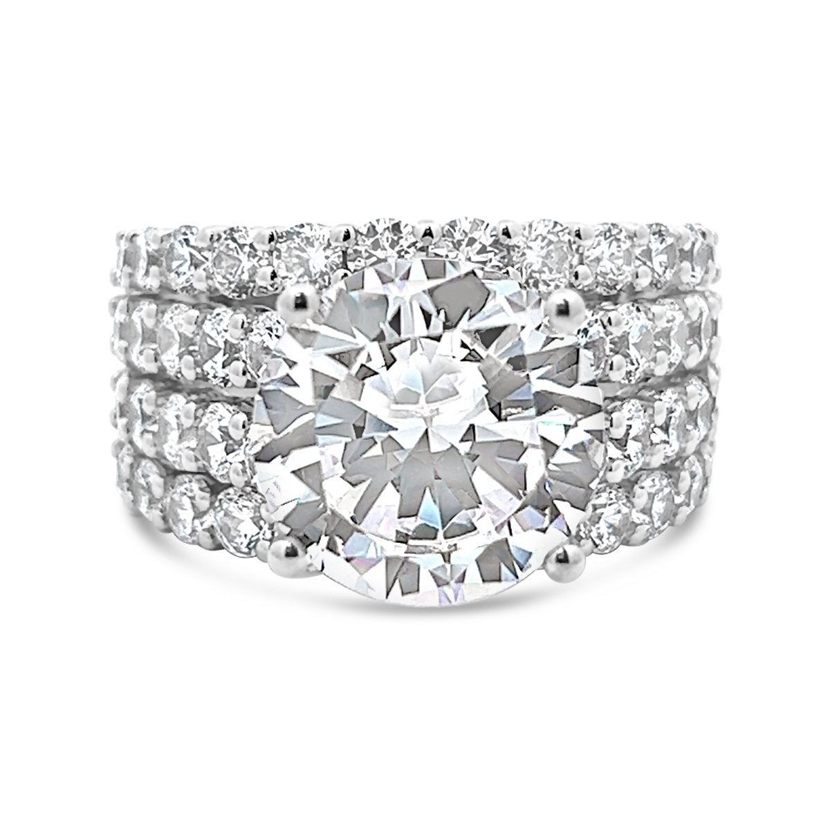 Style No. YJC3528R A stunning four-row wide band engagement ring adorned with shimmering diamonds, making a bold and captivating statement. It is shown with a 5.00 ct Round cut center diamond (Center Diamond Sold Separately)